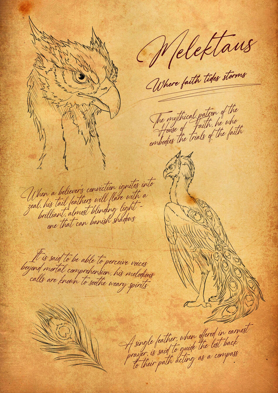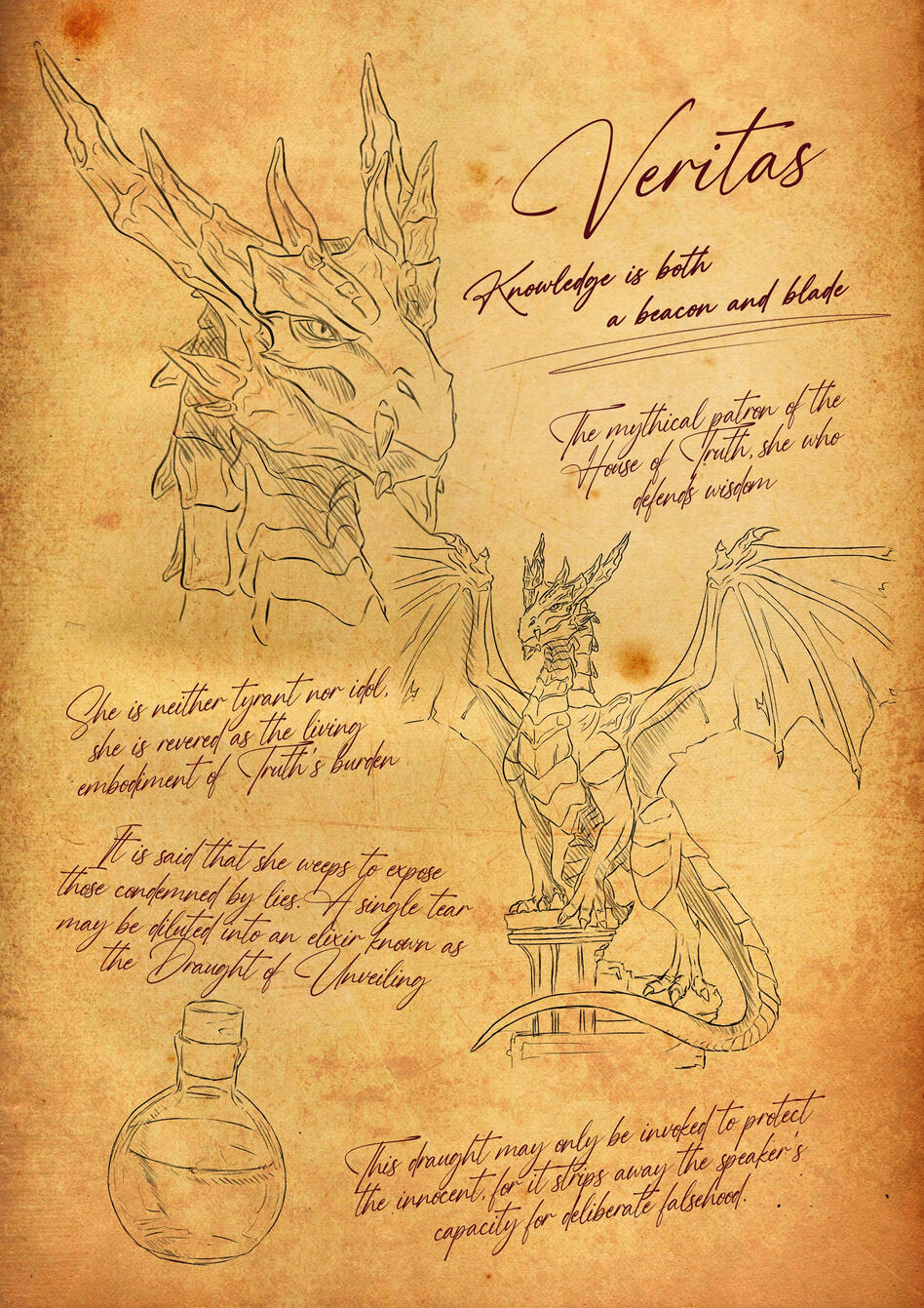 -Inspired by the Roman Goddess Veritas, Latin for "truth," and the personification of virtue.No real reason for dragon other than cool factor + old and ancient being who would've bore witness to a lot of lies and truth I suppose.Took some ideas from Jin Dahaad from Monster Hunter (again) but was a bit too complicated so I simplified it to just cool dragon (that and I had to keep the design complexity between each House relatively the same).