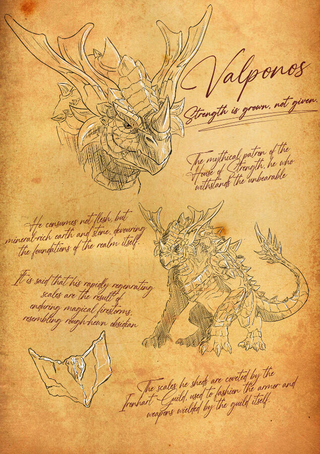 Inspired by the Greek personification of toil and hardship, Ponos. Added the prefix "Val", derived from the Latin word valere (to be strong/worthy).I initially wanted it to look a bit like a tarasque or something similar to Cho' gath from League of Legends. I settled on a rhino, turtle and moose hybrid as I didn't want to delve too far into demonic or eldritch horror.The scales directly contributing to the tools used by the House of Strength seemed fitting, considering the emphasis on labour.