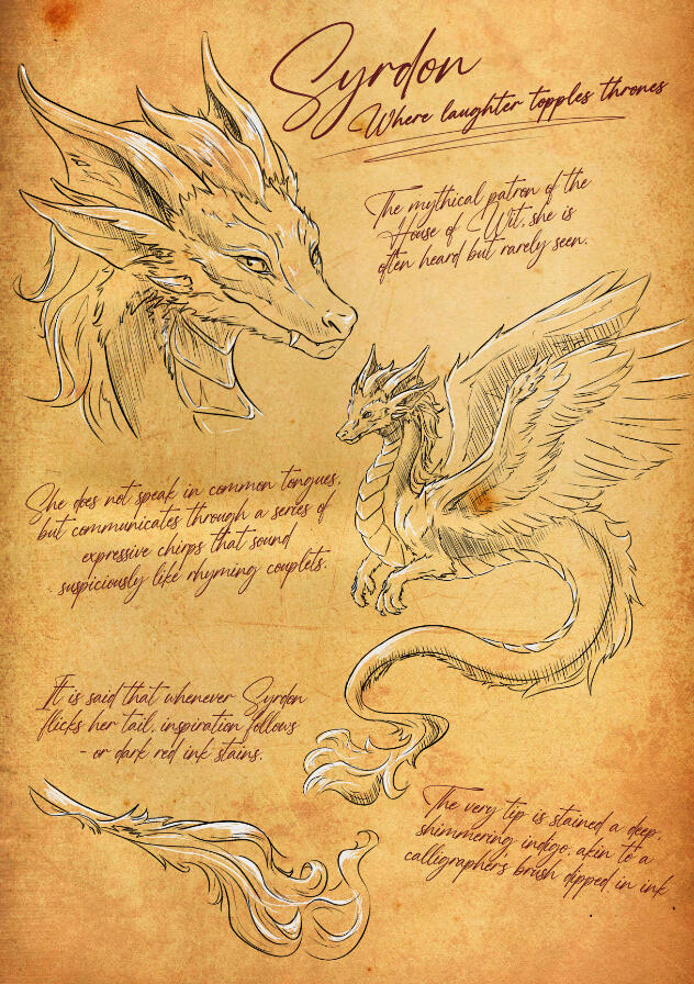 -Inspired by a prominent trickster figure in Caucasian Nart sagas of the same name. I found it important to find someone who's clearly a trickster but leaning towards the lawful good/chaotic good alignment.Foxes are prominently used to represent someone who's sly or cunning, which fit the House of Wit. I honestly wasn't too sure of what I wanted to design outside of having a brush-like tail simulate a calligaphy brush, so a serpent's body felt safest to work with.